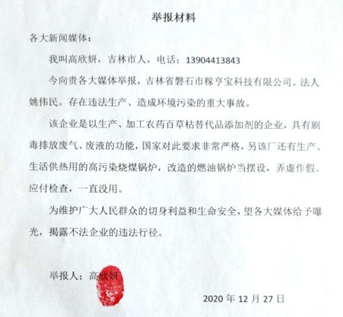 本站讯 近年来,在吉林省,磐石市曾经以软环境建设出名。由于诸多大企业以招商引资形式落户这里,其经济发展比较迅速。但是,就在磐石经济开发区,有一个叫做“磐石嫁亨宝科技有限公司”(简称嫁亨宝)的招商引资企业,近日爆出环境污染问题,先后有两人实名举报该公司环境污染严重。2020年12月28日,记者接到投诉后,立即前往调查采访。