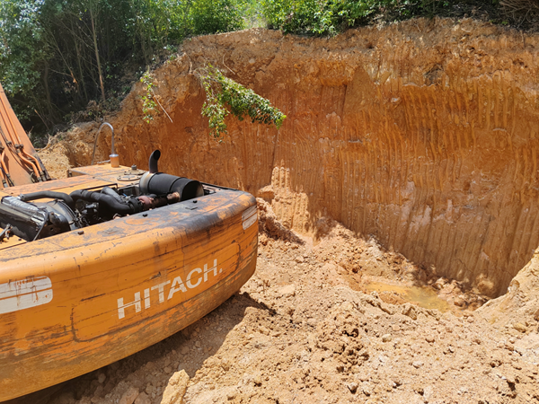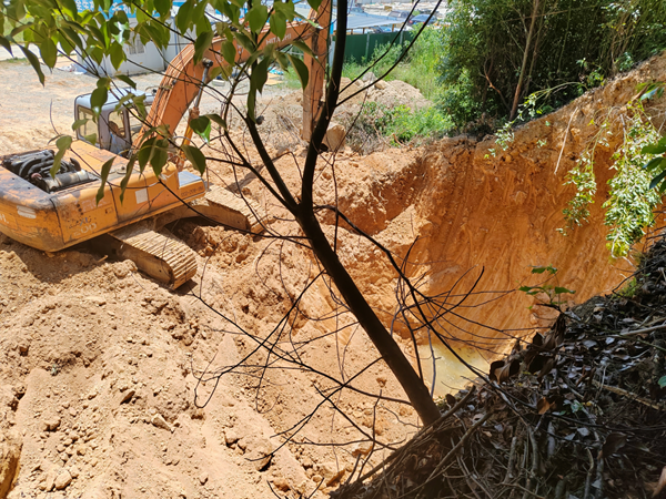 7月19日时近中午,在工地西北角山脚下停着一台大型铲车,铲车处就是一个被挖出约有12米×9米×6米的大坑,山体部分沙土已经外运,场地上还有新铲挖的沙土囤积,深坑底部渗出水来,而被开山挖土的这座小山背部就是一片茶园。据附近散步的居民讲:“按照这个开山挖土进度,这座背负茶园的小山很快将被铲挖成支离破碎。”