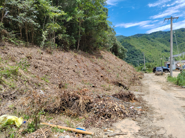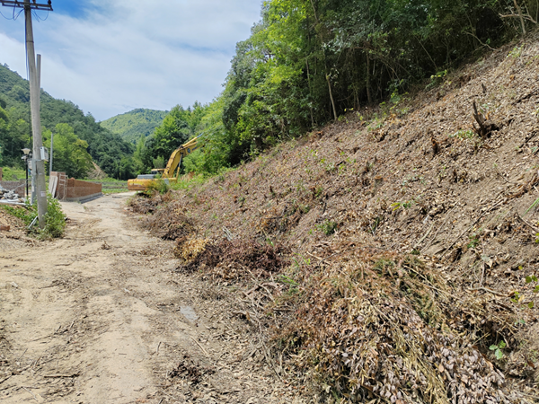同在这一天,笔者调研发现:在杭州市富阳区横桐线黄家桥西北177米处,此处距离富阳选矿厂正门以北不到200米距离的超角度山坡上,约有面积3亩的天然林被砍伐一空。山坡上至今还残留着被砍伐下来的林木和灌木丛薪柴,山坡上被砍伐残留的根部清晰可见,有的直径10-12厘米不等,山脚下是一条进山的水泥硬化小路,现场还停着一台大型铲车,如果此处作为开山挖土用地,那么,该地将潜藏山体滑坡的隐患。