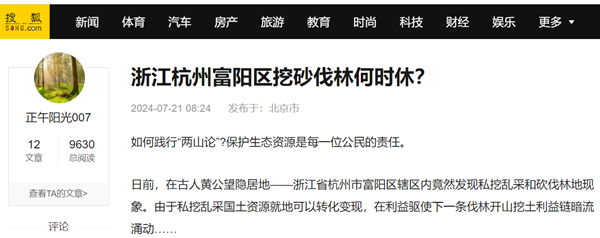 日前,在古人黄公望隐居地——浙江省杭州市富阳区辖区内竟然发现私挖乱采和砍伐林地现象。由于私挖乱采国土资源就地可以转化变现,在利益驱使下一条伐林开山挖土利益链暗流涌动……