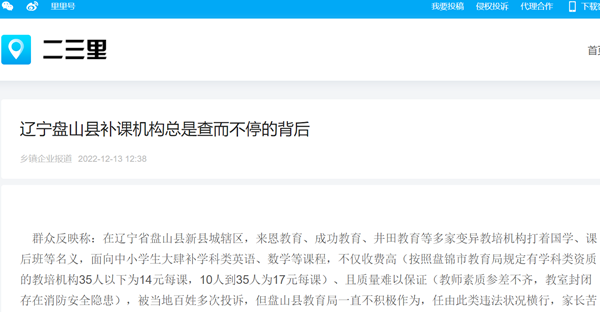 群众反映称:在辽宁省盘山县新县城辖区,来恩教育、成功教育、井田教育等多家变异教培机构打着国学、课后班等名义,面向中小学生大肆补学科类英语、数学等课程,不仅收费高(按照盘锦市教育局规定有学科类资质的教培机构35人以下为14元每课,10人到35人为17元每课)、且质量难以保证(教师素质参差不齐,教室封闭存在消防安全隐患),被当地百姓多次投诉,但盘山县教育局一直不积极作为,任由此类违法状况横行,家长苦不堪言。