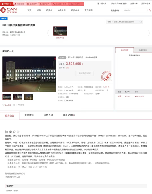 而这期间的2018年12月,在租赁合同未到期的情况下,朝阳市龙城区农村信用合作联社与英德学校张文奎校长商议解除合同将租赁房屋进行拍卖,购买者为时任英德学校校长张文奎之妻刘某某。据中国拍卖行业协会网络拍卖平台显示:朝阳经典拍卖有限公司于2018年12月15日成交标的为3826600元房产,房产位于位于龙城区七道泉子镇东三家村。土地使用权面积:8905.3平方米,证号:龙城国用(2002)字第1202002029号,房屋建筑物面积:3785.2平方米(无产权手续),此房屋正在出租(租期至2020年8月31日止),土地使用权之内的部分建筑物不在本次拍卖范围内。