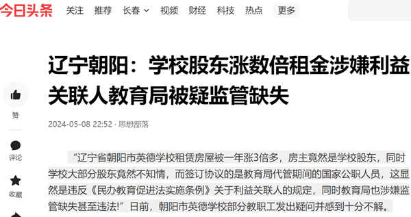 “辽宁省朝阳市英德学校租赁房屋被一年涨3倍多,房主竟然是学校股东,同时学校大部分股东竟然不知情,而签订协议的是教育局代管期间的国家公职人员,这显然是违反《民办教育促进法实施条例》关于利益关联人的规定,同时教育局也涉嫌监管缺失甚至违法!”日前,朝阳市英德学校部分教职工发出疑问并感到十分不解。