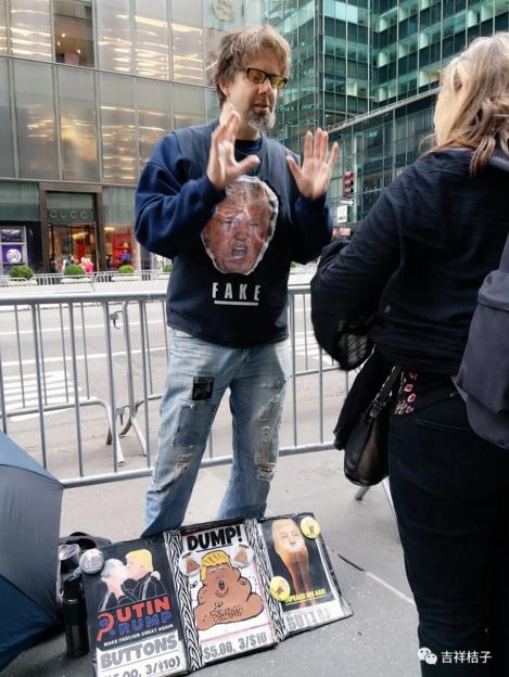 视线从老人身上挪开,发现他并非一个人在战斗。在他旁边,有个胖子在售卖像章,这不是普通像章,而是川普丑态大集合!像章上,川普的脸被P成大便、屁股等,被极尽丑化。