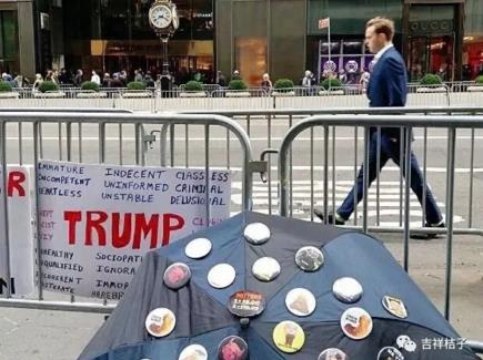 早闻美国言论自由,但第一次亲见骂领袖,还是险些闪瞎眼。我举起手机想拍老人,却从镜头里惊奇地发现,老人背后的建筑,竟然就是川普大厦!
