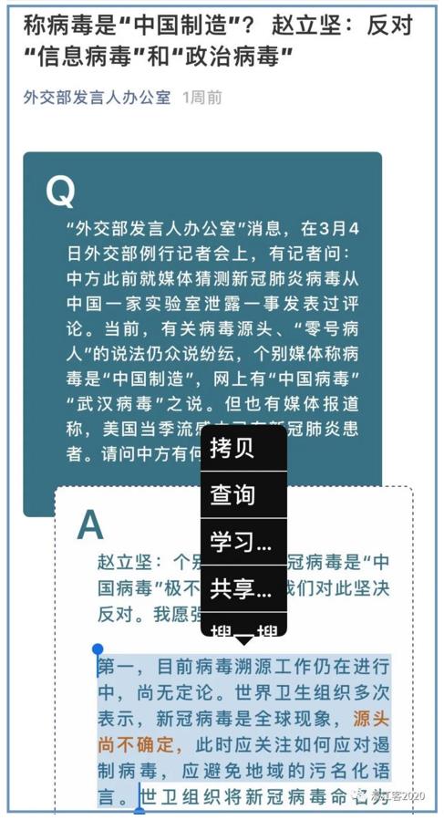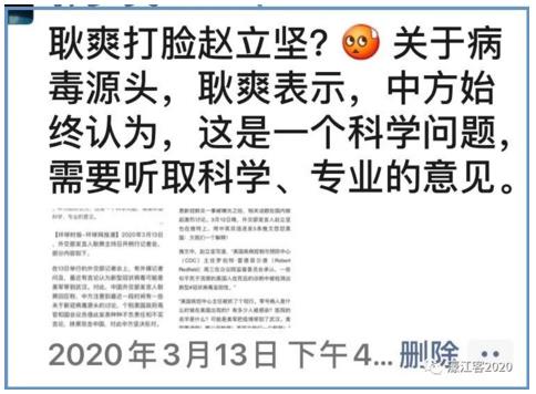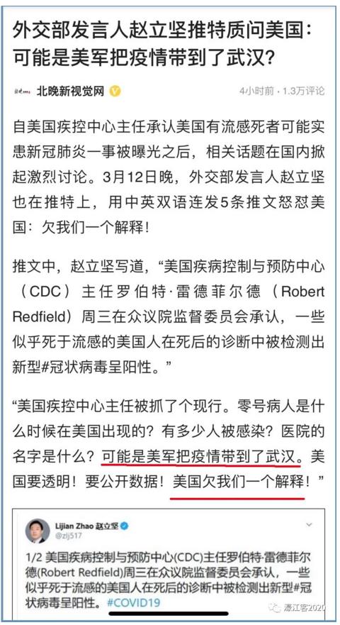这一事件,就是连日来在社交媒体圈广泛流传的、外交部发言人赵立坚在海外社交媒体平台发文质疑美国是武汉疫情源头事件。