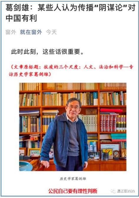 在接受马国川采访时,葛剑雄表示,对于这次疫情源自“人造病毒”,或者实验室泄露或者来自国外的各种各样的说法,我从一开始就认为,这些说法是胡说八道。社会上大多数人是没有判断能力的。有些人自以为有知识、有判断,实际缺乏基本常识。“阴谋论” 是不要证据的,只是一旦被某种势力所利用,就显得更加阴暗。