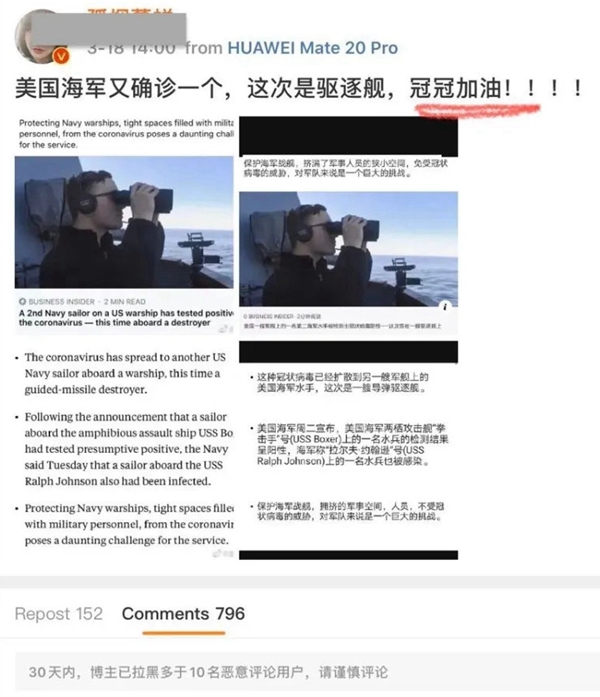很多国人就是这样,灾难不是真真确确发生自己和亲人身上,他就是一个冷漠的看客、幸灾乐祸者、离谱的还是落井下石者。不知道什么时候开始中华民族道德沦丧到这个田地?还是一直都是如此只是我不知道而已?微博上一位拥有几百万粉丝的知名博主,在得知美国相关疫情消息后居然激动的喊出四个字“冠冠加油”,天啊,你还是人吗?竟然新型冠状病毒在你眼里哪里可爱称为“冠冠”,为什么不把你喜欢的冠冠带回你家里去?真是一句话把十几亿人的面都丢光。先不谈国外,就说我们国家多少人感染上了新型冠状病毒?又有多少人死于新型冠状病毒?又有多少人因为新型冠状病毒生计出了问题?这种垃圾居然几百万粉丝关注,这条恐怖的微博下面竟然超过6100人点赞。估计全世界只有中国会出现那么不可思议的社会现象,要不是疫情,我还真不知道神经病有那么多?种种毁三观的事情层出不穷,不服不行。你们不是傻,是真的坏。