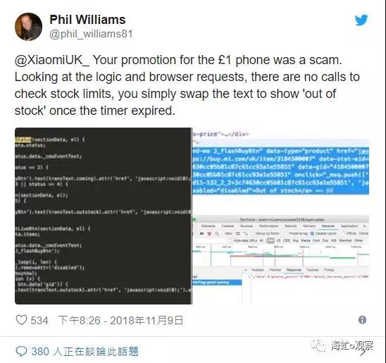 可在英国,偏有人怀疑,而怀疑者偏偏又是厉害的角。一位名叫菲尔·威廉姆斯的键盘侠,破解了抢购网站的信息代码,他惊讶地发现,抢购按键的预设信息设置根本没有检查库存的操作,而是直接显示“手机售罄”。也就是说,无论你抢点多快,都注定无法抢购成功,因为这本来就不存在,属于典型的欺诈行径。丑闻一经披露,绅士的英国人再也无法绅士了,他们开始愤怒地抵制小米产品,并激烈而粗口地“辱华”。这就是小米产品在英国一直举步维艰的主要原因,信誉至今也干净不起来。