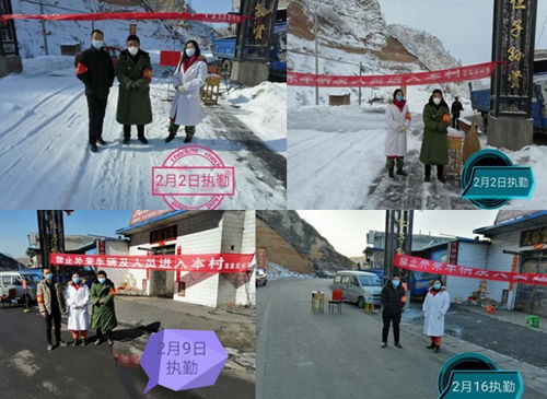 作为一名乡村医生,在疫情面前,她意识到自己的重要性,身先士卒,积极参与。老天都好像在考验一个人的意志和毅力一样。每次轮到她们这组执勤,天气异常的恶劣,2月2日冰天雪地,封山堵路;2月9日气温骤降,滴水成冰;2月16日,寒风呼啸,瑟瑟发抖。但是越是恶劣的天气,越能彰显出她伟大的身影,她仍然来的最早,走的最迟,严防死守,一辆辆过往的车辆逐一登记,体温测量,排查是否外来人员,确保安全方可通行,真正做到农民健康的“守门人”。