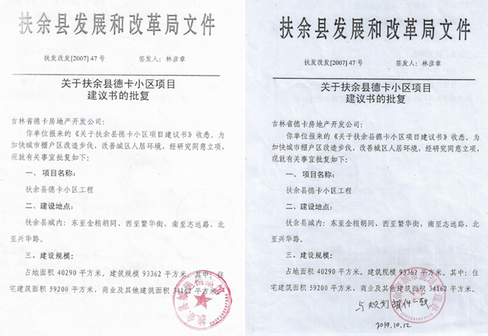 德卡公司随即向法庭补充三份证据,均为扶发改发[2007]47号文件加盖扶余市规划处及档案馆印章的文件,可以证明扶发改发[2007]47号文件真实存在,并称该份文件是扶余发改局下发给德卡公司的。这时,被上诉人又称:“对三份证据的真实性庭后核对(德卡公司对媒体说,是不是回去找部门商讨又要造假?),同时该文件系发展和改革局文件,上诉人提交的证据上加盖了规划管理处和城建档案馆的公章,并不能证明该文件真实性,该文件即使存在应当也未实际履行。