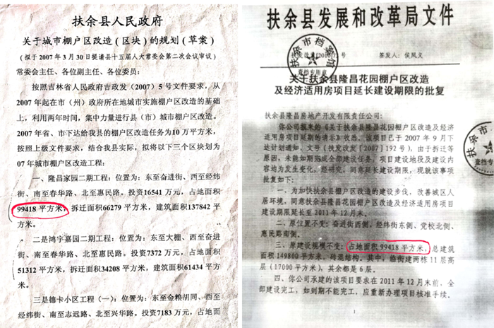 政府一方的说法立即招致德卡公司的强力反驳:为什么被上诉人矢口否认?因为此文件批的内容根本没有“经济适用房”字样。但是,被上诉人在二审提供的《扶余县发展和改革局文件》扶发改发【2010】73号关于隆昌花园却有“经济适用房”字样,我们怀疑这份文件是为了应对这次诉讼在开庭前伪造的,用这个带有“经济适用房”字样的所谓文件,应付德卡公司,以便证明给德卡限价是正确的,不用补偿(详见一审德卡公司提供的证据:由政府提交人大通过的扶人常发【2007】5号文件)。政府一方提交的证据证明:隆昌家园棚户区改造占地面积是99418平方米,扶人常发【2007】5号文件在2007年3月30日通过;但被上诉人二审提交的扶发改发【2010】73号关于隆昌花园占地面积同样是99418平米,却有“经济适用房”字样(见贴图1、2),可他们卖的价格每平方米是3000多元,又说庭后向法庭提交相关证据德卡公司害怕:难道又想造假?)……(很显然,政府提交的所谓文件前后矛盾,肯定有假。