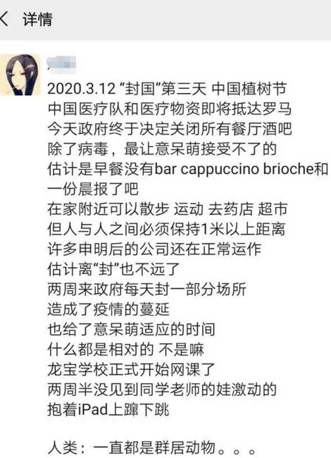 当然习惯不是一天养成的, 对热闹惯了的很多意大利小青年来说, 呆家里真是度日如年。所以出现了网上流行的那个可爱的南部老奶奶给孩子们的建议,让他们在家读书追剧。我的脸书里,前几天还没有一个意大利朋友在谈疫情,都是花花草草美食美景,自从“封国”令颁布之后画风大变, 很多朋友表示“这是前一阵某些人不负责任的行为带来的后果,面对没有常识的人,只能硬来”。还有一位上了年纪的画友, 平时是个优雅的女士,发了一条硬核动态,把我都吓住了, 她用巨大的粗体字写到: '如果呆在家里让你觉得心慌, 那我告诉你,有意识的时候被插管堪称恐怖(难以磨灭的人生经历)”。哎呀妈呀,估计那些还想趁着停课出去浪的意大利孩子看到,都给吓得把迈出门的一条腿又抽回来了。我在伦巴第的朋友说, 现在街上空荡荡的, 大家就是上班,回家,超市,这三个地方。在橙色区域,除了超市药店之外的店铺虽然关门了,但生产企业还是可以工作的。我在科莫的一位开丝绸厂的朋友,决定给员工带薪休假两周, 算是为自己也为雇员的安全考虑,尽一份社会责任吧!