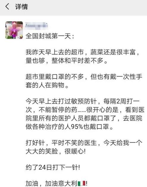 首先, 我得大写加粗地说: 意大利目前疫情非常严重是事实, 但医院之外的社会非常平静有序而且物资供应也有保障,这也是事实。 朋友们发给我看的各种恐怖消息,基本都是假的,或是夸大其词的。闲话少说,上证据。虽然我因为中意两国先后爆发疫情而被打乱了回意大利的计划,目前呆在国内,但可以看看还在意大利生活的那些朋友们的朋友圈啊!