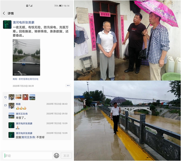 “一夜无眠,有惊无险,防汛保电,克服万难。回衙换装,转移阵线,条条数据,还要奋战。”这是7月23日,方城县清河镇供电所所长张英豪在微信朋友圈分享的文字和图片信息。7月22日,张英豪带领电工们连夜抢修电路,天空中浮起一片鱼肚白的时候,才从村里赶回镇上,还没来得及休息,一个电话让他们又换上衣服和抢修工具,匆匆出发赶往下一个地方。