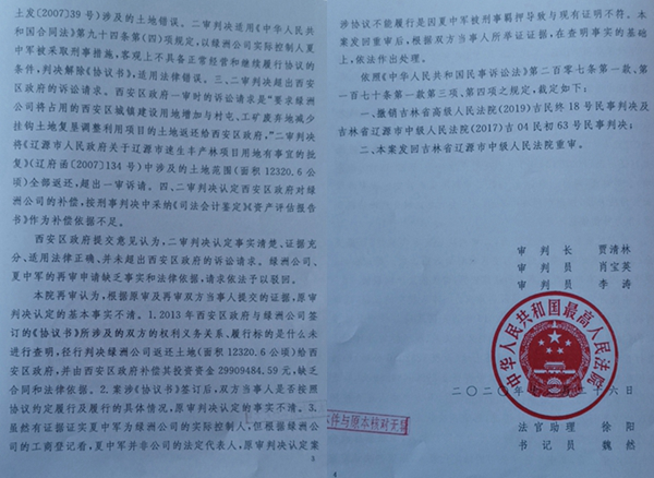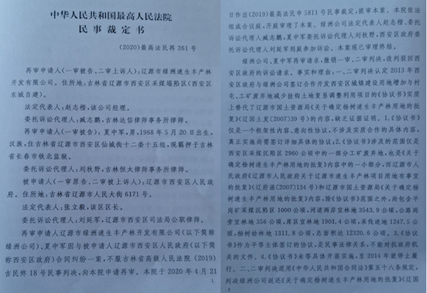 本站讯 日前,最高人民法院做出(2020)最高法民再261号民事裁定书,裁定原审判决事实不清,撤销原判,发回重审,从而终结了吉林省高级人民法院和辽源市中级人民法院一错误判决。至此,辽源市西安区人民政府(以下简称西安区政府)与辽源市绿洲速生丰产林开发有限公司(以下简称绿洲公司)一场持续三年多的土地官司终于出现了新的拐点。