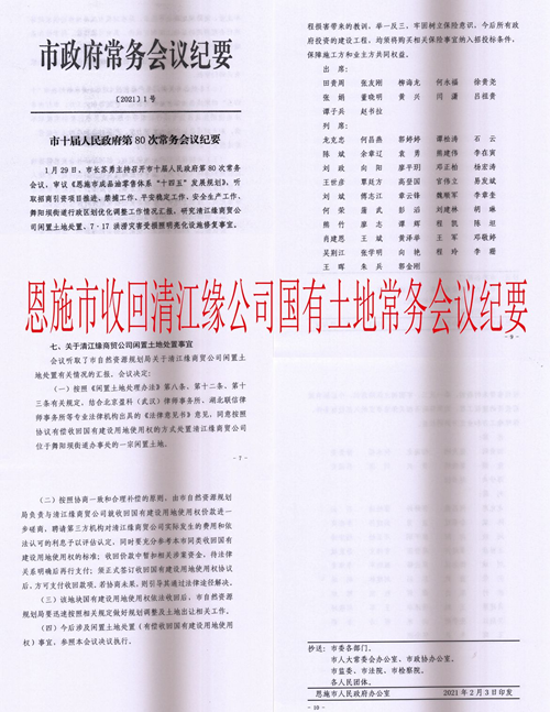 2019年11月,恩施市政府已出具会议纪要同意收储清江缘公司的土地,但恩施市自然资源和规划局在收储过程中单方面违约毁约。
