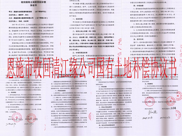 随后,恩施市政府于2021年2月3日又出具了 [2021]1号常务会议纪要。2021年2月9日,清江缘公司与恩施市自然资源和规划局签订了《收回国有土地使用权补偿协议书》,协议书明确约定了收回范围及补偿范围及标准,以双方聘请的第三方机构出具的评估结果为准。