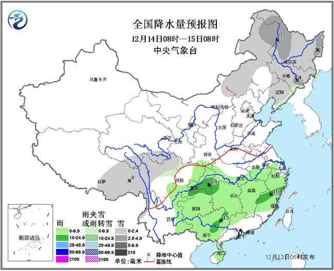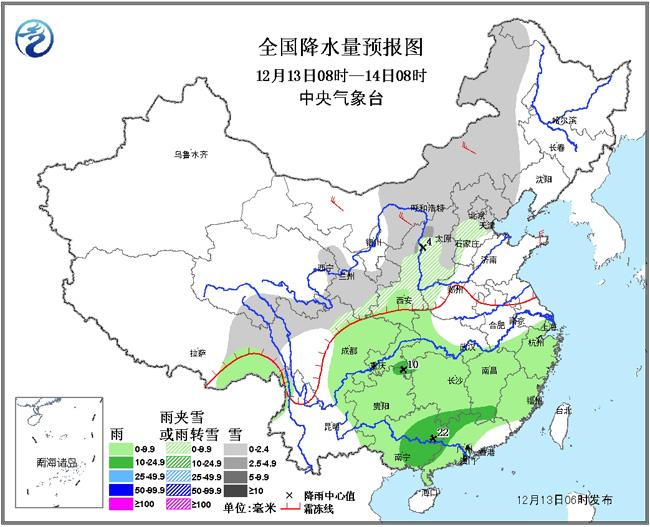 13日08时至14日08时,西北地区东部、内蒙古中东部、华北大部、西藏东部等地有小到中雪或雨夹雪;西南地区东部、江汉西部、江南、华南大部、西藏东南部等地有小到中雨。内蒙古中西部、西北地区东部偏北地区等地有4~6级风。