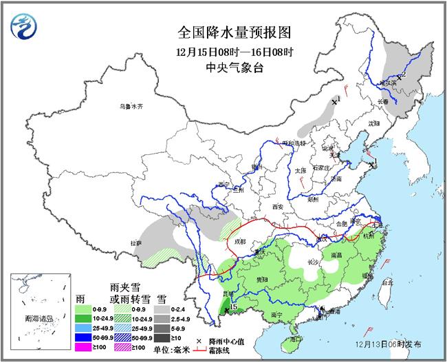 15日08时至16日08时,内蒙古中部、东北地区中东部、西藏东部、青海南部、川西高原等地有小到中雪或雨夹雪;西南地区东南部、江南东部、云南东部、华南中西部等地有小到中雨或阵雨。内蒙古中东部、华北等地有4~5级风。