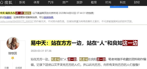 2月12日,方方的日记题为《武汉人的痛,不是喊喊口号就能够缓解的》,抨击那些喊空洞的人。第二天易中天以一篇《武汉铆起,马屁精滚开》,表达了对方方的支持。他在文章中说:“武汉要的不是口号,而是实实在在的援助。他们心中的痛,正如方方所说,也非口号可以缓解。”他响亮地喊出“武汉铆起”,指出“一线需要的不是廉价的同情,空洞的口号,更不是无聊的吹捧,而是——理解。”他呼吁所有媒体,“多点理解,少吹牛皮。守住底线,不唱高调……请学会说人话,请学会懂人心!”
